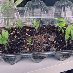 卵パックで簡易保温器。 気温が低い時は蓋閉じて輪ゴムで留めるだけ。 もう少し育ったら、間引いて苗ポットに移植、後、プランターへ移行します。