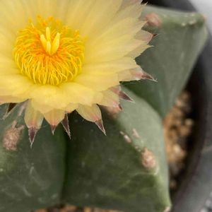 ヘキルリランポウギョクが開花しました😆✨ 優しい黄色のお花が可愛いです🥰 もじゃもじゃの筆のような花芽を見つけてから、毎日楽しみにしていました😆🎶 サボテンは開花時間が短いから、咲いている状態を見られると嬉しいです💕