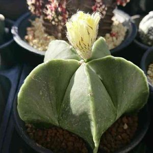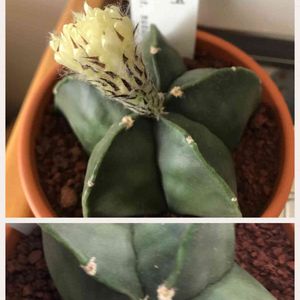 サボテン科 アストロフィツム属 碧瑠璃鸞鳳玉。😸😸 台風の影響で、避難させてて、昨日仕事から帰宅後に我が家の日照台へ戻していたら、碧瑠璃鸞鳳玉さんの花が咲いていて、日光が足りなかったせいか しぼみ始めてまして…😅 今朝も確認しましたが、画像の様に夕べのままでした…😅 今回は残念ながら開花は見れなかったのか?咲き損じたのか?…😅わかりません…😅 次回に期待します。😊