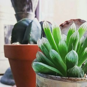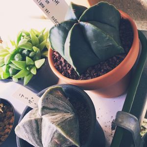 植え替えまだギリギリ大丈夫なはずなのでプラ鉢だったこのコ達をちっちゃい陶器に収めてはい!ナイス✨ ̄  ̄)👍✨