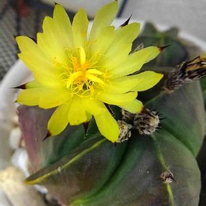 ダイソーよりお迎えしたサボテン🌵 碧瑠璃鸞鳳玉かな? ちょっぴり亀甲が入ってます。 3.5号鉢でちょうど良いサイズです。 モケモケしてるのは蕾? それとも咲き終えた花がら?