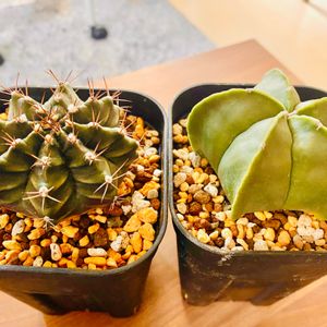 この前の植え替え中に右手親指にトゲが刺さってまだ痛いちょりです👍💦 2日前に針でほじったけどトゲがまだ残っとって痛いのか針でほじった所が痛いのか分からん😅💦 写真のこの子たちはこの前の足痛リハビリで園芸店に行った帰りにダイソーに行ったら300円で売ってた牡丹玉とアストロフィツム。 アストロフィツムとしか書いてなかったけど碧瑠璃鸞鳳玉であってるよね? ランポー玉は何度も買おうと手は伸ばしてたけどまぁーまぁーな値段するから毎回見送りしてたから初のランポー♥ 100均にこんなんまで売り出されてたら嬉しい反面、価値が下がる気がしてなんか複雑だな💦