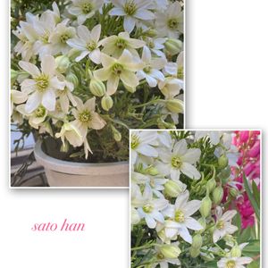クレマチス ペトリレイ 白い桜を🌸思わせるお花 ひと目見て直ぐに手に取り おもちかえりしました 意外にお安くて 1080円はお買い得では 近所のホームセンターでは これの4分の1お花で 680円の値札が🌸🎶