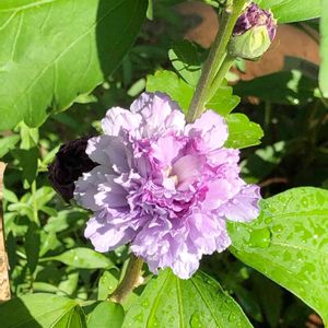 🌱今年デビュー🌱 🌸ムクゲ 紫玉🌸 雨☂️ 雷⚡️ゴロゴロ 晴れ☀️ 今日の天気は…🤔 晴れ間のお花なので雨粒💧付きです😊 影も…