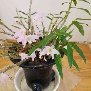 テンドロビウム系(キンギアナム ベリーオダ?)満開になりました。今は(二週間前から)トイレに飾ってます❗️はい 市販の消臭剤より良い匂い、イイエ 育てた、育った、咲いてくれた花だから、一日必ず十数回以上行く場所に飾らせていただきました。いく度会話しながら用足せます(自己満足) これは失礼‼️ (一ヶ月以上飾れます)購入五年位になります。私みたいな初心者でも、株分けや流木付けにと数倍になりながら咲いてくれます。ご近所知人宅に嫁いでいます。トイレの神様❗️喜んで見てくれるでしょうか?(助言で手直し)