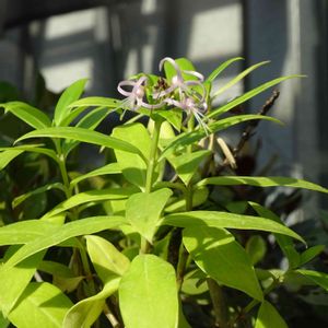 ★シマザクラ(島桜)★ アカネ科の常緑小低木 花期:7〜10月 母島、父島などの小笠原諸島の固有種 高さ1〜1.5mほど。薄っすらと紫色を帯びた白い花を咲かせる。枝先に集散花序を伸ばし花をつける。 サクラの名が付くが、サクラの仲間ではない。 ※集散花序…最初の花は軸の先端につき、その下から出る側枝に次の花をつける。 2025.9.22 筑波実験植物園(C温室)📱
