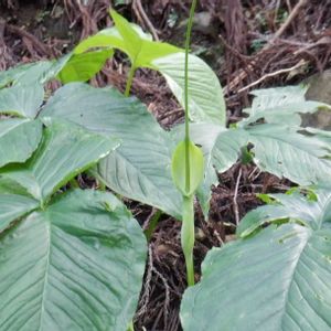 オオハンゲ(大半夏) サトイモ科ハンゲ属 カラスビシャク?と思ったのですが、どうも違うみたい。 カラスビシャクよりも大きな感じがしました。 葉も大ぶりです。 生えている場所もカラスビシャクは日当たりの良い畑の脇でしたが、オオハンゲはうっそうとした森の中の斜面でした。 そこで調べてみたらオオハンゲだと知りました。 場所:豊川市 本宮山