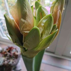 前に投稿した巨大球根の 花が あともう少しで 咲きそう🎵 蟹の爪からだいぶ花に 近づいてきました。笑