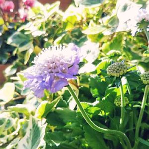 休憩していたスカビオサん達💤 少し前は一輪も咲いてなくて 緑々しい葉っぱさんだけがルンルンしてましたが(-∀-)🌿 気づけば蕾が沢山上がってきてて数日前の台風の影響による雨風にも負けずまた咲き始めました✨(*’ω’ノノ゙☆パチパチ ~✨ これはアメジストスノーだけどギガや他のスカビオサん達も一斉に🙌ワーイ✨ 逆に今まで元気過たブルーベリージェラートさんが一気に失速気味なので休んでいただこうと思います😎