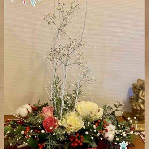 クリスマスアレンジpart2 白い枝はたぶんニシキギを白く染めてます葉牡丹にキラキラファイバー キラキラカスミソウ ピンクのバラ 名前わからず😅 ユーカリ・ブルーアイス・ オレアニアブルースモーキー・ ネズミモチ・庭のクリスマスホーリー🔴 ワタの木
