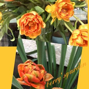 今日のお花がチューリップだと知り、 チューリップの過去picで 1番ゴージャスだと思っている 思い出のチューリップを投稿します。 上は海外のお花屋さんの切花 下は佐倉のチューリップ畑で、 10本500円で抜いてお持ち帰りし、 庭に植えたチューリップ🧡 同じチューリップだと自己満足🧡