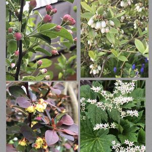 こんにちは😃❗️ 蕾を📸✨して来ました💓 ↗️ブルベリー🌿💜🌿 ↘️ヤグルマ草はもう咲いていますね😅。 ↙️メギ🍂💛🍂 とても鋭い トゲが有ります。 ↖️姫リンゴ🌱🍎🌱 …正式名は⁉️⁉️