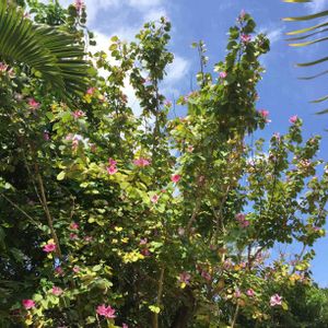 なんとなくツツジに似てる。マメ科の植物、ようていぼく。細かい種類はわかりません。ここは海に近いところだけど山の中にもいる。空が綺麗だったので上の方をパシャリ。4mぐらいかなぁ。