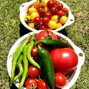 夕方からかなりの雨☔予報😮💨 水割れ前に収穫🍅🫑 庭の芝生はあまりの暑さに黄色くなりかけていたので恵みの雨かな☝️