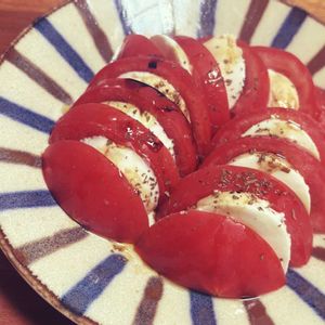 大玉トマト🍅とモッツァレア☝️ バジル🌿とオリーブオイル🫒と塩🧂でシンプルに頂きま〜す😋
