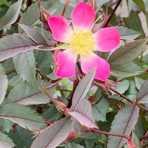 紫灰色の葉に華やかなピンク色✨ 一重の可愛い薔薇の花🌹💕 『ロサ・グラウカ』✨ 花が終わったら赤い実も素敵♡ 通りがかりに咲いていて 大好きになった花🌹🌿 先日 やっと勇気を振りしぼり この花の事を尋ねたら 小さな苗木を頂いた✨ せっかく頂いたのに、苗木が枯れたように見える😅💦 元気に育ってね🍀🌈