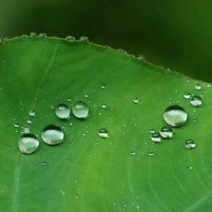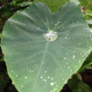 『里芋の葉』 里芋の葉の水を弾く力はすごいですね! 葉から落ちる時、水は流れるのではなく、転がり落ちるという感じです😁 いくつかの水滴が合体する直前で、止まっている状態で撮影しました。 この直後、風が少し吹いて、水滴は合体しながら、一瞬で転がり落ちました🤗