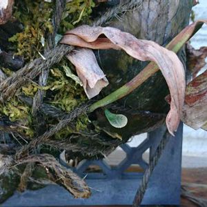 蘭とビカクシダ達の植え替え終了。 水苔のポロポロ対策で ためしに水切りネットを使ってみる。 簡単に植え替えできたけど 見た目が気になる。。