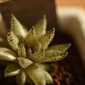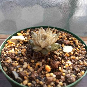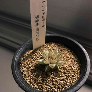 ハオルチア、レティキュラータ。油断すると茶色く日焼けさせてしまう小さなハオルチア……というか、置いている場所は同じなのに、ヅして茶色くなったり緑に戻ったりするのか。早く子吹きして鉢一杯にもこもこしてほしい。