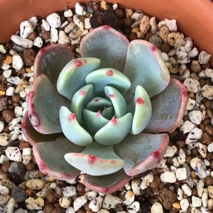 お久しぶりです。 秋にダイソーで買った名無しのエケベリアちゃんの現在のお顔です🌿白っぽく上品なお姿になりました。かわいいです。 そろそろ春です。 雪が溶けたらまた色々投稿したいなと思います🙏