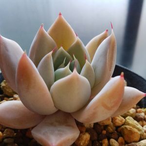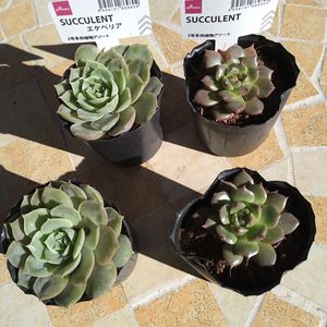 今日は寒くて北風ビュービューです🍃 DAISOの謎多肉(左上↖️) 形が、100均バイオレットクイーン(左下↙️)と同じような形になってきましたー!夏に形が崩れやすい💦💦 でも色が全然違う🤔 秋にカメムシに好かれまくって穴があいてキズだらけに😂 中心だけキレイなので、春前にカットしようかな😁 DAISO オンスロー?(右下↘️)な子も中心からほのかにピンク色に🤗💕 古い葉は我が家の環境にあわず枯れ、一回り小さく😅💦(葉挿しもしたけど😁) 今年は寒くて雪が降ったりもしたけど、今の所、無対策でも元気そうです🥰 右上↗️の白い子もDAISOの謎エケさん😁 最近、寒すぎて、気温差がなくて、紅葉が薄い気がします😂 春が待ち遠しいな😁
