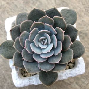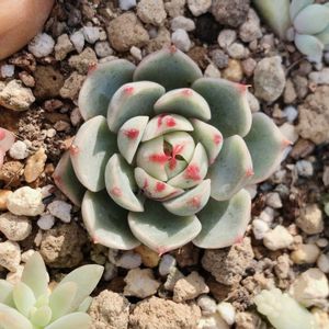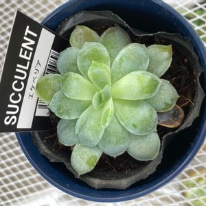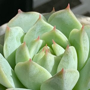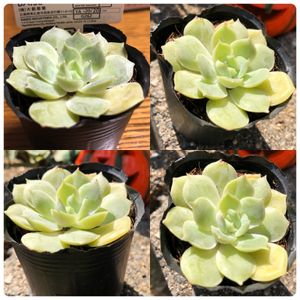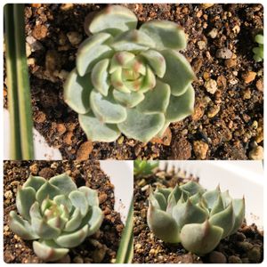 謎ベリアのひとつ。 タグ行方不明。1年前までお迎え写真撮る習慣なかったから、もう謎のままかな。購入は2018年?寄せ植え用カット苗で寄せ植えしたり葉挿し並べてる写真残ってたから。葉挿しの結果はというと白い虫がギョッとするくらい沸いてるの見つけて捨てた😂その後エケベリアの写真ないから成功体験ないまま、そのまんまやめちゃったんだと思う。去年また多肉やろうって時には、底穴なしのマグやガラスコップに赤玉単用で植わってたからね、びっくりよね😅よくぞ生きててくれました、ありがとう。それから見様見真似で胴切りして、約10ヶ月後にはディープグリーンからのピスタチオグリーン😁ちょっと紅葉も。前は初冬から春先まで室内管理だったから、こんなお顔は初めて♡手もかからず、すごく育てやすい子。葉挿し率も良好!どっかから購入時のタグ出てきたら、跳ねて喜ぶかも😁