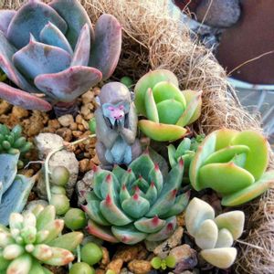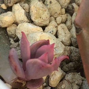 エケベリア🍀ダスティーローズ🌹 3月末に胴切り✂️から3ヶ月🍀 上のpicはカットした頭の方、発根も早く、しっかり根が張って来ました👌 左下/葉挿し苗、4っのうち1っは根だけ出て親葉が大きく成長したのでポイッ(-_- )ノ⌒、 右下↘カットされた親株からも3っ👶誕生😍 元気に育ってね😘