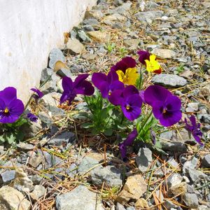去年、ビオラ寄せ植えに種がたくさんの出来たので、職場の駐車場の端っこに種をばら撒いておきました。 葉っぱはちっちゃいのに、花は1人前です😀