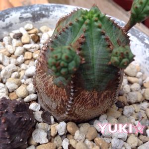 ユーフォルビア、オベサブロウ。検索するとにゅうっと変な形に徒長している写真がたくさんヒットする……ということは、コイツは徒長しやすいに違いないとにらんで、なるべく明るいとこで育てています。その甲斐あってか、やや細長くはあるけれど、徒長せずに済んでいるみたい。