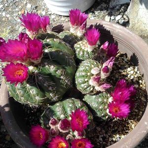 すみれ丸君 咲きました🌸 花が「芍薬」の花に似てる ところから しゃくやく丸 の別名もあるみたいです ボディーは深緑で棘は株に沿って 生えるので 痛くない👍 水は好きなほうで冬に太陽を 沢山浴びさせると幾つもの 蕾をつける 扱いやすい サボテンです😊🌸