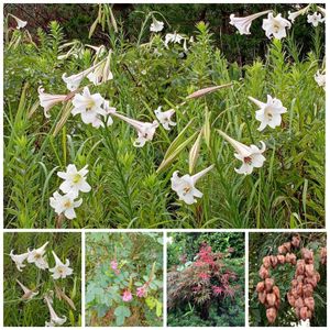 一面の百合です🤗 この百合最近そこかしこ何処でも見掛けますね😬 右下は数珠になるとかいう実のその後、緑がすっかり茶色に😨
