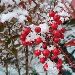 最近になって、ようやく雪が降るようになりました🐱 庭のナンテンの赤い実が映えてました✨