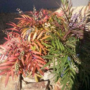 細葉柊南天✨ 実が綺麗な紫色になってきました😆 ただ、頑固に紅葉しない枝が…車の影で日光不足なのかな❔