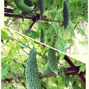 去年の我が家の畑でハウスの骨組みに誘引したゴウヤです😉👌 この年も食べきれずに御近所さんに配り歩いた🙆💕うふふ😊