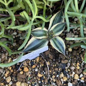 2025/10/07 ロファンサ クワドリカラー。(五色万代) 放ったらかしでも元気に育つから 土が乾っからに乾いてた😅 気づくと子株出してるのよねー 昔は観葉植物で売られてて アガベだった事にビックリしたな