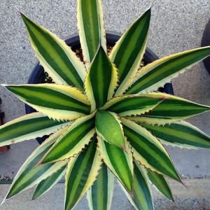 初アガベ✨第2弾✨ 吉祥冠 錦•*¨*•.¸¸♬︎ 昨日のpicの子と一緒にお迎えした子✨ この子は多肉花壇へ植えつけたのですが 昨日主人が仕事から帰ってきて 『鉢植えのがいいんじゃない?』と まさかの助言😂 今日 急きょ鉢植えに変更しました🪴 これで満足かしら? 今まで全く興味がなかったのに😂 よっぽどアガベが気に入ったみたい😂 『レアな子がほしいよなー』と主人… これから先 どーなるのかな😆 わたしはピンクのお花が好きなのに アガベがメインになりそうな予感😅