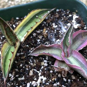 メルカリでお値打ちのアガベさんを見つけて、ついにお迎えしてしまいました。 王妃雷神白中斑2つと、五色万代、笹の雪のセットでしたが、思ったより状態が悪く、問い合わせたら王妃様をもう一個送ってもらえました。なので3個もいるんです(;´∀`) 下葉ブヨブヨで取ったらだいぶ小さくなりましたが、心配だった根っこもでてくれて一安心。1個しか掘り起こして確認してないですけど。 五色万代は欲しいわけではなかったけど、置いてみるとかっこいいです😊