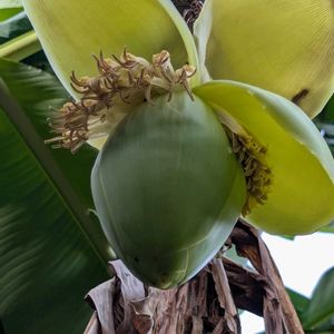 雌雄同株 草丈3mほど 緑色の花茎が約80cm 伸び〰︎黄褐色の苞葉に 包まれた花が現れる🎶 未熟な果実 バナナ🍌 より小さくマズイ💦 (寺院のお庭) 芭蕉(ばしょう) バショウ科
