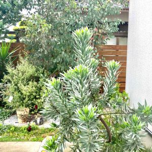 久々のリューカデンドロン・シルバーアフリカーナ🌿 冬も3回耐えて、今年は猛暑で少しへばってますが元気元気💪先日かなり剪定したんですが…元気なところ切りすぎたかも🤣💦 一日1回しかあげてませんが1.6メートルになってからホースで50秒くらい水がいります。結構な量ですがちょうどよいみたいです🌿