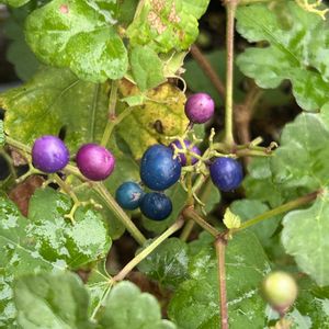 🍀斑入りノブドウ🍀 雨風強いのに頑張って写してきたよ。😅💦 ピントが合わなくてボケボケだけどお許しを〜🙇🙇 去年置き場所だと、勝手に切られてしまうので フェンス側に鉢を移動させました。 🏷2のつく日は斑入り日 🏷つぶつぶの日 🏷ちっちゃいものクラブ に参加させて下さいね。