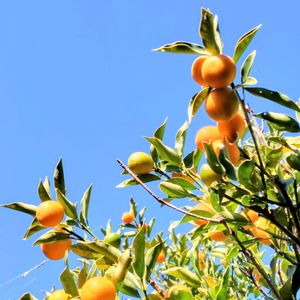 こんにちは😊✋ 外出先で見つけた👀 柑橘の実🧡 (品種はわからないです😅) 細い枝に4個も実をつけて 枝が折れない様に 実ってました🤗 葉っぱの間から🌿 こちらを 見ているみたいです🎵 まだ上の方は 薄い緑色の部分が 有ったので これから 黄色くなりますね😀 🍊🧡🍊🧡🍊