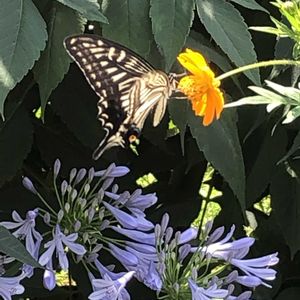 ♡アガパンサスとナミアゲハ🦋♡(5枚投稿) いつものようにリビングから庭を眺めていると小さなお客様アゲハチョウ🦋がヒラヒラ花から花へと飛び周り アガパンサスが気に入ったようで1つ1つの小花を吸蜜しながらアガパンサスの周りを何度もくるくるしていました😆 キアゲハかなぁ〜🤔 調べてみると翅の付け根の模様からナミアゲハでした。 ①左側に🦋 ②アガパンサス全体 ③右側に🦋 ④アガパンサスの周りをくるくる🤣 ⑤アップで翅🪶の付け根がストライプ模様がナミアゲハ!だそうですよ。