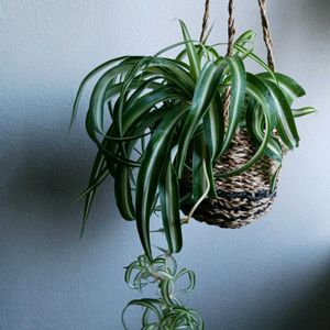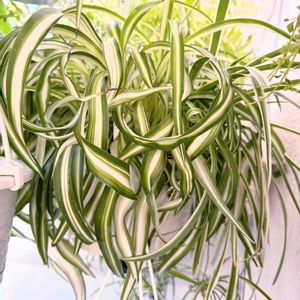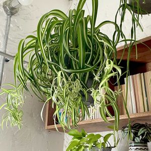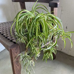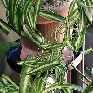 オリヅルラン ボニー💕 オリヅルランの一般的な中斑(中央が白で外側が緑)、逆の外斑(中央が緑で白の縁取り) 全緑葉、そしてボニー(中斑だけどクルクルの葉っぱ)の 4種類を育てています。 子のボニーは、クルクルの葉っぱが可愛いんです♡ でも、まだランナーは2本。 土中からの新芽は増えて鉢はギュンギュン。 ランナーに小さな子株が付き、少し成長してきただけ。。 もっとたくさんの子株が出来るのを期待しているんだけど(^-^;)