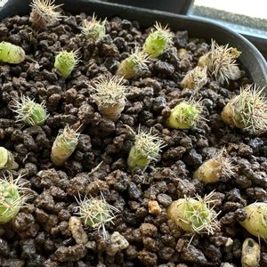 9月に入りましたが、サポ達の植え替えをためらうくらい暑いですねぇ。 それでも、すみれ丸(旧ノトカクタス)が、おそらく高温障害と思われる状態で7月から動きを止め、昨年4月にヒョウにベコられた傷跡と未だ戦っている獅子王丸(旧ノトカクタス)も動かなくなっちゃったので、この二つだけとりあえず引っこ抜きました。 そしたら、獅子王丸の根元の鉢表面にびっしりみっちりひしめき合って新芽が生えてまして、あまりにぎっちり生えてたので逆に気付かないくらいの量、軽く50以上あったもんですから、ベコられた子がこの先どうなるかわからないので、育ちの良い新芽を選り分けて育ててみることにしました。 今年6月の下旬に何種類か種まきしたんですけど、その子達と同じかそれ以上育ってます。 あのギチギチでよくまぁ今まで育ったなぁ。