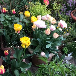 1番咲きそろった時。 今年のチューリップはこちらの場所には八重ばかりをチョイスしました。 日持ちもいいし好きなのですが、意外とユリ咲きのヨハンクライフも長かったです。