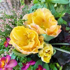 💗💛八重咲きチューリップ フォクシーフォックストロット 💛ビオラ 初めてのダブルデッカー✨ 🌷葉っぱが元気よく出てきてくれたとき ٩(˃̶͈̀ᗜ˂̶͈́ )وヤッター‼︎ ビオラとの共演💛💗💛楽しみにしていたのですが。。。 ちゃんと蕾が付いたのは5球中2球⤵︎ どうして〰︎⁉︎ 難しいなぁ( •᷄ •᷅ ).。oஇ 💗💛八重咲きで可愛く咲いてくれたのは1球だけ💖 (開ききってない方は花びらの数が少ない〰︎) でも 🌸桜の開花🌸の便りが聞こえてきたと同時期に 咲いてくれて✨ありがとう💖