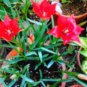 ミニチュウリップ❤ 球根を植えるのが遅くて、 春に葉がでだしても花芽らしきものがなかなか芽生えなくて ここ何日かの雨で一気に花芽もできて咲いてきました❤ 結構大きめの花に(*_*)笑❤