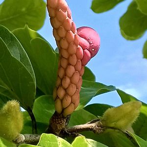 🌳木の花・蕾たち その140 ニシキモクレンの蕾(錦木蓮) 私の記憶では紫木蓮の木だったはず… ( ̄^ ̄)ゞ ↑この後、錦木蓮だとわかりました。 ほわほわで暖かそうです♬ 良い日曜日を…🍀 🌀コメントしあいながら、 分かったことをちょっと付け加えたいと思います( ´ ▽ ` )ノ このモフモフがついた芽は「冬芽」 そしてモクレンは枝先に花が付くので、 この枝先に着いた大きな冬芽が「花芽」、 花芽の近くにある小さな冬芽や枝から出ている冬芽は葉っぱになる「葉芽」。 それから、このモフモフは芽を保護しているもので「芽鱗」といいます♪ 因みに、保護するものがない芽を「裸芽」と言うのだとか… 色々な名前があることがわかりました💕 ✨ ❄️ *・゜゚・*:.。..。.:*・'❄️'✨・*:.。. .。.:*・゜゚・*❄️✨ ⌘ メモ ⌘ 🔸科名・属名 モクレン科 モクレン属 🔸学名 Magnolia liliiflora (Magnolia quinquepeta) 🔸英名 Mulan magnolia 🔸別名 モクレン(木蓮) 🔸由来 ❇︎シモクレン 花色に因む ❇︎モクレン(木蓮) ハス(蓮)に似た花が咲く木という意味合い 🔸原産地 中国 🔸花期 4月~5月 🔸花色 複色(外側が紫内側が白) 🔸特徴 落葉低木。樹高1~5m。 自生地は中国南西部の雲南省、および四川省で、 中国や日本で古くから栽培されている。 自生地以外でも帰化植物として定着。 モクレン属の野生種は、日本を含むアジアとアメ リカに約90種が分布している。 観賞用として栽培される種も数多く、マグノリア と呼ばれる。 日本では、平安時代中期に編纂された『和名類聚抄 (わみょうるいじゅしょう)』にこの名が見られ、 古くに中国から渡来したことがうかがえるそう。 花は葉の展開と同時に開花する。 花期になると分枝した枝の頂部、または葉腋に、 紫色~濃紅色の花を上向きに咲かせる。 花は長さ8~13㎝程度の大きさで、微かに芳香が ある。 花被片は9~12個で、外側3個は萼片状で披針形 で小さく、多くの場合緑色をおびている。 葉は互生し、長さ8~18㎝、幅3~13㎝の倒卵形 ~広楕円形。葉柄は1~1.5㎝程度。 当初は観賞のためではなく、漢方で「辛夷」 (しんい)と呼ばれる蕾を、頭痛や鼻炎の薬と するために植えられていた。 🔸品種 ❇︎ハクモクレン(白木蓮) 中国原産 花色は白 樹高高は5m~15m で20mに達する高木。 単幹で幹が太くなる。 花期は3月~4月上旬。 花期になると、分枝した短い枝の頂部に、白色の 花を上向きに咲かせる。 花弁は9枚。花径10~15㎝程度、芳香がある。 花は葉の展開前に開花。 ❇︎キンジュ(金寿) 園芸品種。 本種は、アメリカ原産のMagnolia acuminata (キモクレン:黄木蓮)種から、母種よりも色濃 く鮮やかな黄花種を日本で選別育成した園芸作出 品種。 花色は緑がかった黄色 黄花モクレンとも呼ばれる。 樹高は15~30m程度。 全体的に美しい円錐形の樹形を作る。 上向きに咲く大輪で花径10~15㎝程度の花が 開き切る。 ほぼ葉の展開と同時にで花を開く。 秋には葉が黄葉する。 ❇︎サラサモクレン(更紗木蓮) モクレン(シモクレン)とハクモクレンの交雑種。 1820年にフランスの植物学者エティエンヌ・ ソランジュ・ボダン(Étienne Soulange- Bodin)によって行われ、1826年に初めて花が 咲いたと記録されている。現在では100を超え る品種が作出されている。 花色は白からピンク、薄紫から赤紫など。 花期は3月~4月。 花期になると分枝した枝の頂部、または葉腋に 花を上向きに咲かせる。 花は大きなもは花径20㎝を超え、芳香がある。 ※花の大きさは品種による。 花被片は9個で、外側3個がやや小さい。 花被片の形は細長いものから丸いものと多様。 耐寒性、耐暑性に優れている。