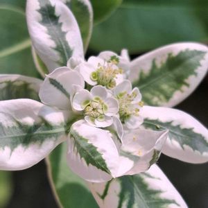 パキスタキス🤍💛🥰💛🤍ニ年目 黄色のホウから飛び出した白色の花 酷暑が続き カーポート裏の半日陰へ移動 (たくさんの植物達で混雑中) 切り戻し後 深めの受け容器で 鉢底3cm浸水状態へ 久々に様子を見に行くと 元気復活 2025.9-7
