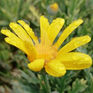 梅雨です ジメジメうっとしいです😞 って言うか、大雨です🍃🌀☔ 災害レベル❓⚠️ せめてお花で癒されましょう 雨粒を受ける ユリオプスデージーです・・・ 💛💛💛💛💛💛